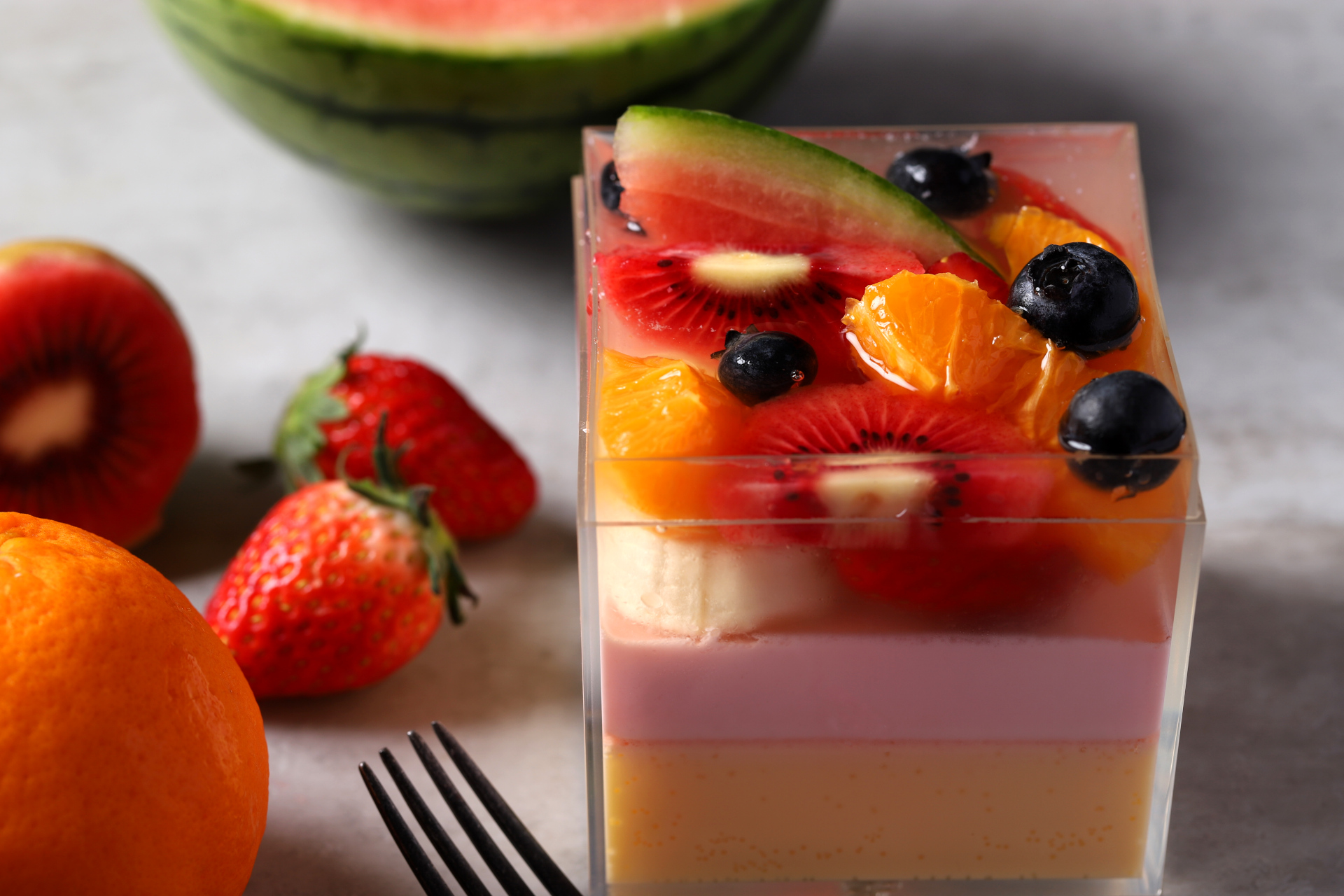 カスタードプリン、苺のパンナコッタ、たっぷりの季節のフルーツを